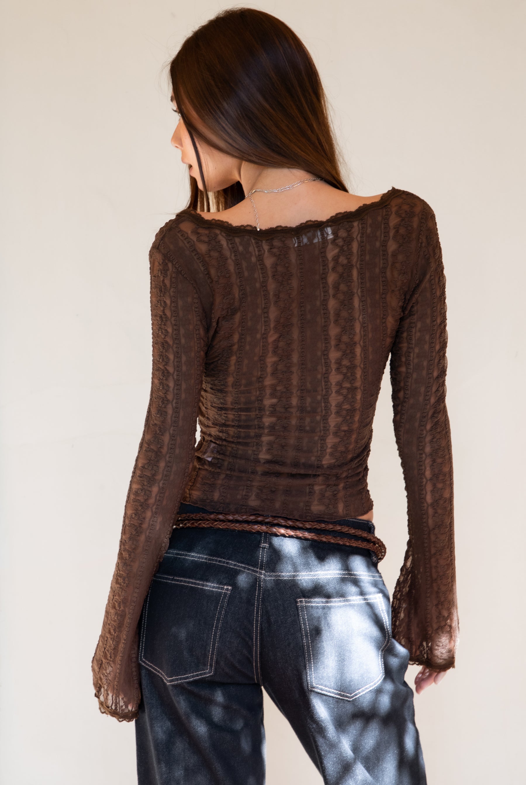 ARLETTE Scalloped V-Neck Long Sleeves Sheer Lace Top